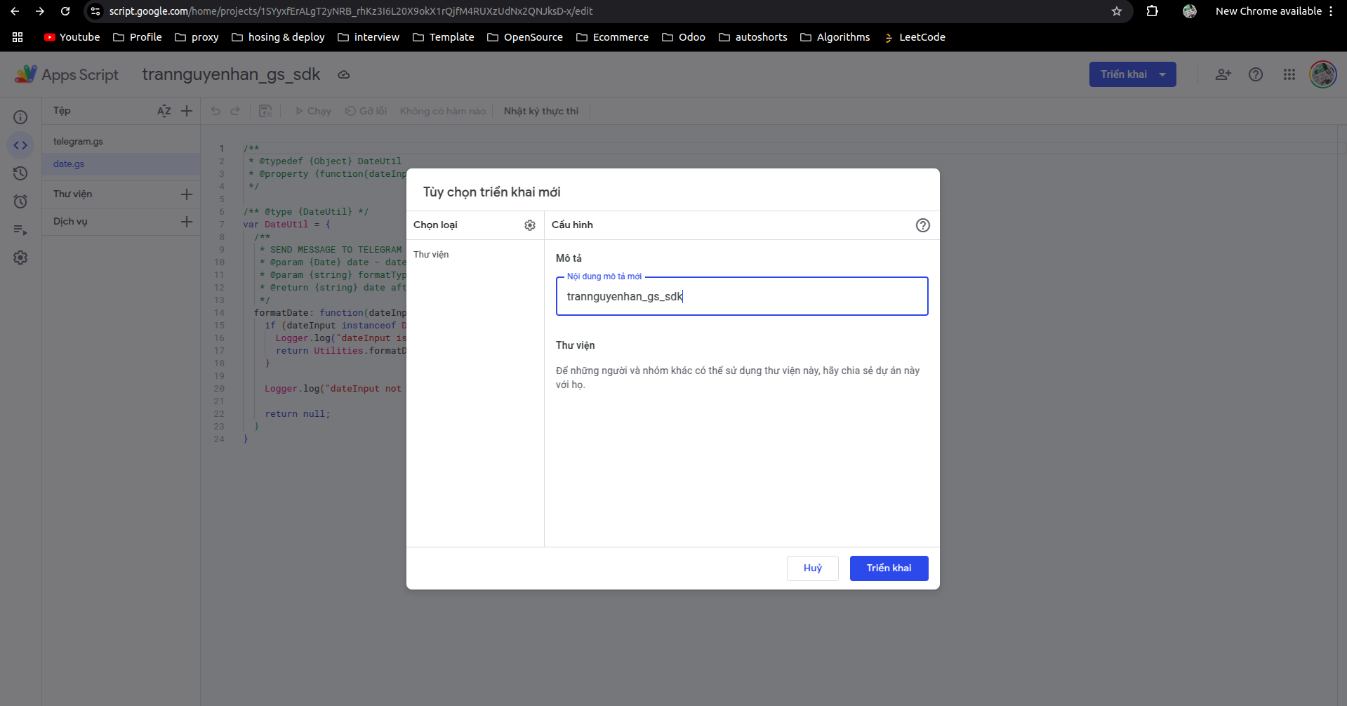 Nhập mô tả cho tùy chọn triển khai và bấm triển khai. Xong khi triển khai xong nó có một đoạn mã là mã ID triển khai, ID này không phải là ID dùng để import thư viện nên bạn không cần để ý tới ID này và tránh nhầm lẫn: